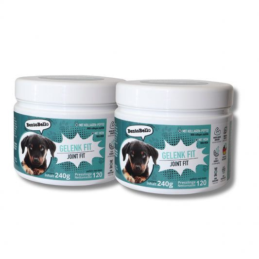 Unsere innovativen GelenkFit Presslinge und Kauknochen sind speziell entwickelt, um die Gelenkgesundheit Ihres Hundes zu fördern. Die einzigartige Formel unterstützt nicht nur bestehende Gelenkprobleme, sondern wirkt auch präventiv. Durch den regelmäßigen Gebrauch können Sie dazu beitragen, die Mobilität Ihres Hundes zu erhalten und altersbedingten Verschleiß vorzubeugen